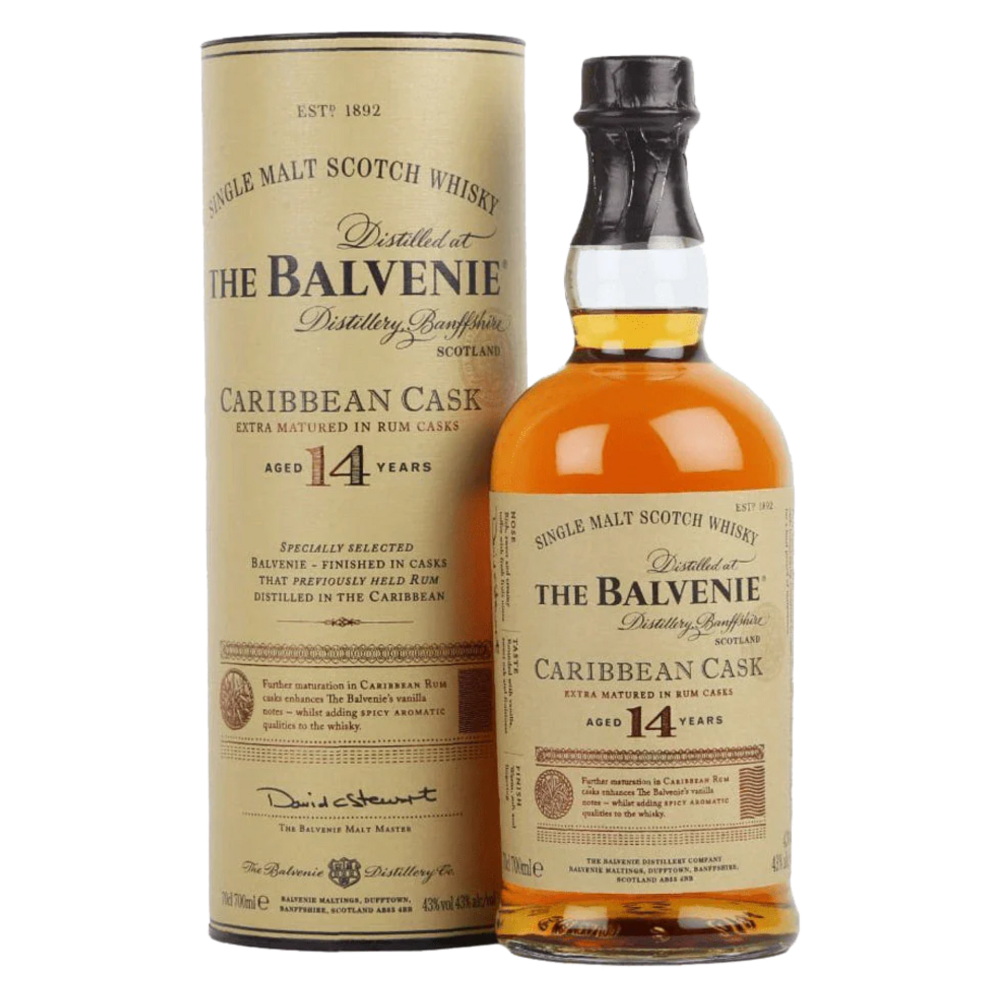 The Balvenie 14 Year Old Caribbean Cask Speyside Single Malt Scotch Whisky is produced by The Balvenie Distillery, a traditional Speyside producer in Scotland known for its hands-on approach to whisky making, including on-site malting and coopering. This expression is matured for fourteen years in American oak ex-bourbon casks before being finished in casks that previously held Caribbean rum, imparting a distinctive layer of sweetness and exotic character.