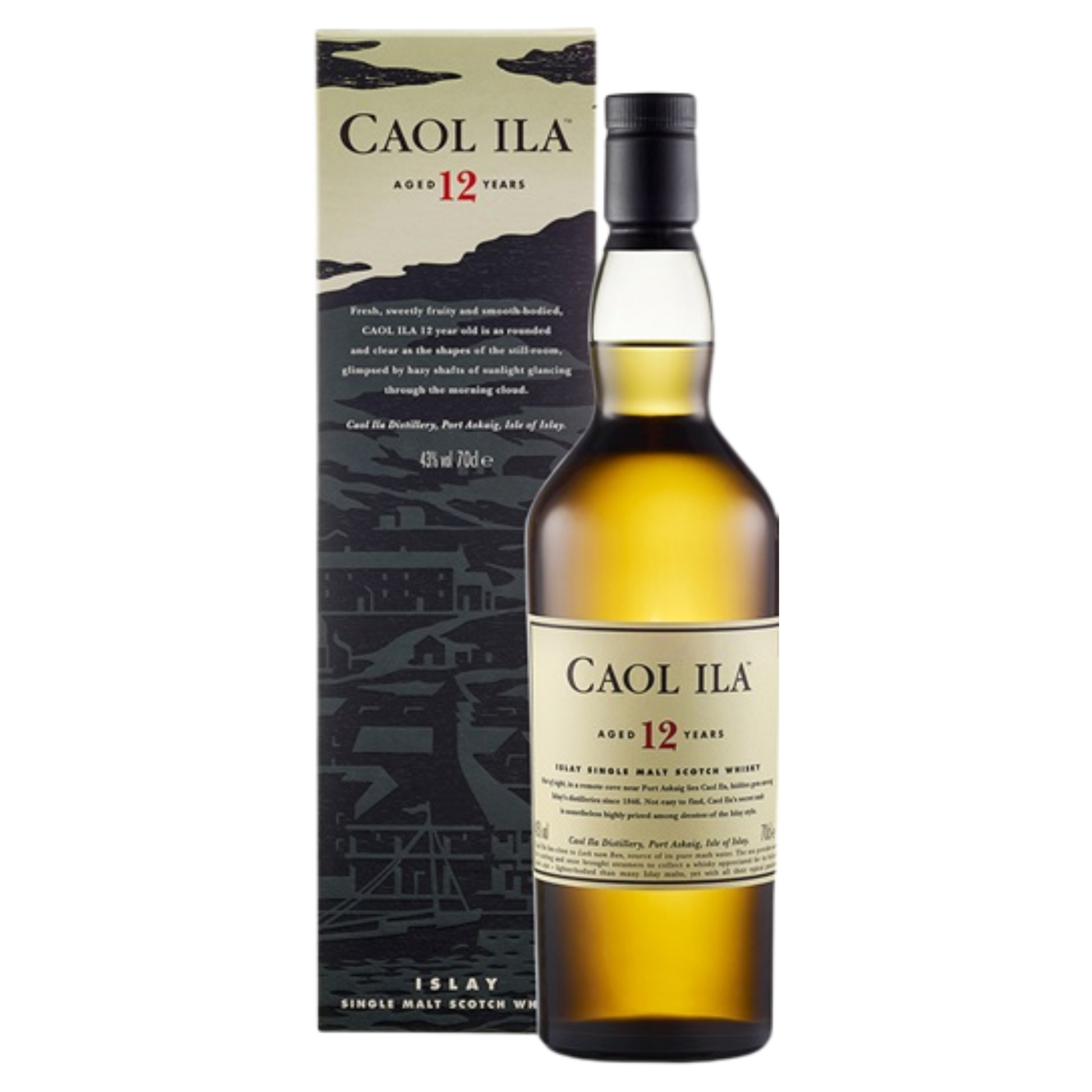 Fresh, sweetly fruity and smooth-bodied, Caol Ila 12 year old Single Malt Scotch Whisky delicately balances a range of tastes. The clean, appetising nose shows subtle citrus fruit with just a puff of smoke. Firm and smooth, it begins sweetly then yields a fragrant smokiness and a sweet-smoky, lingering finish.